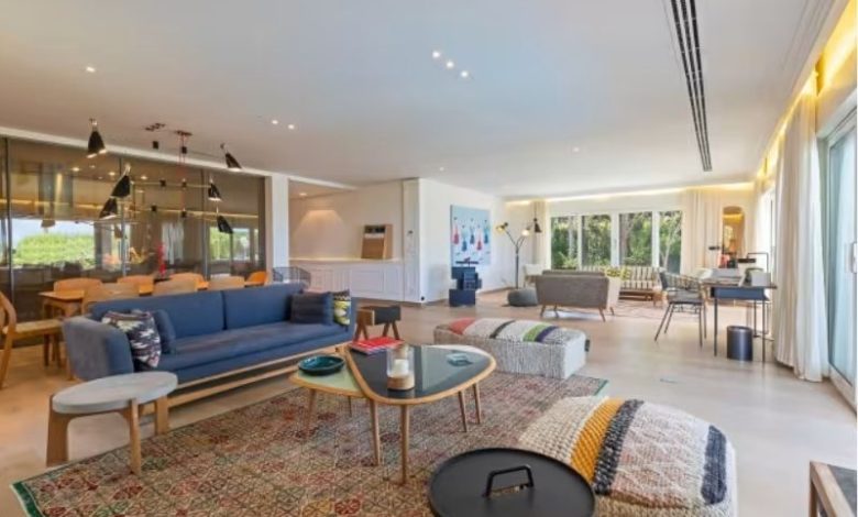 Features vibrant contemporary interiors adorned with distinctive artwork reflecting refined taste. The living room flows seamlessly to the terrace and pool, offering captivating beach views. Open-plan design includes two living areas, office, and dining corner.