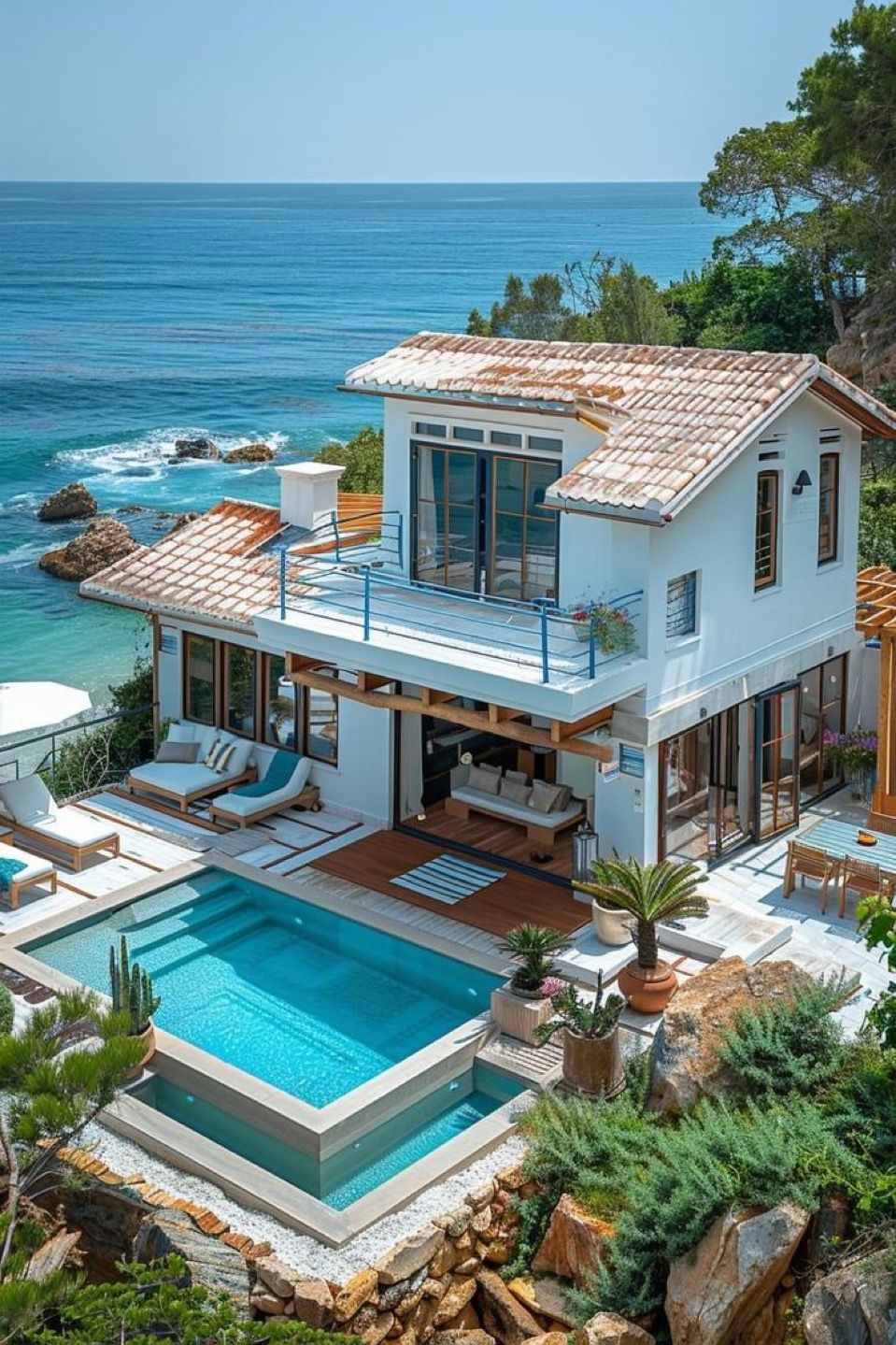 - The architecture is warm and inviting, using earth tones and textures that contrast beautifully with the stark white of traditional coastal homes.